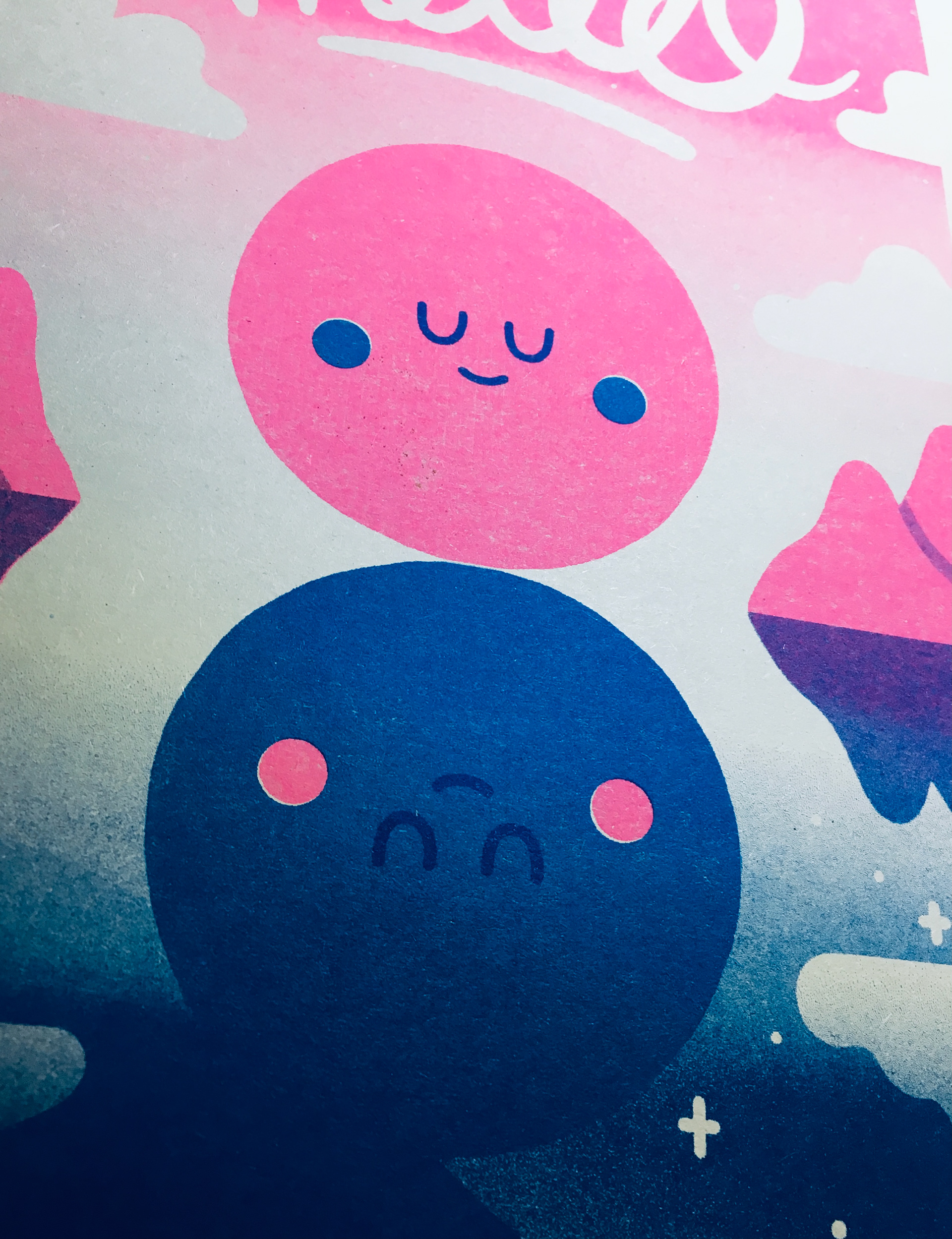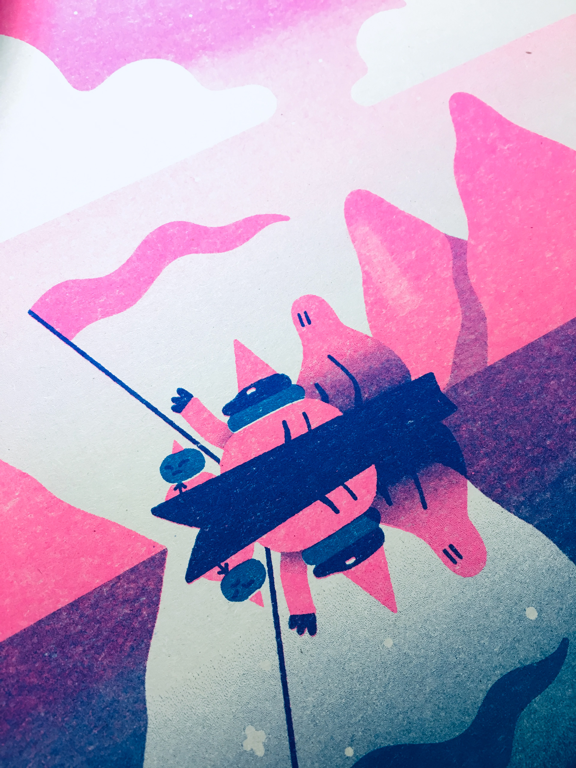 Below is a analog Risograph test print. Each colour layer is drawn out in black scanned onto the Risograph machine and printed in the selected colour.